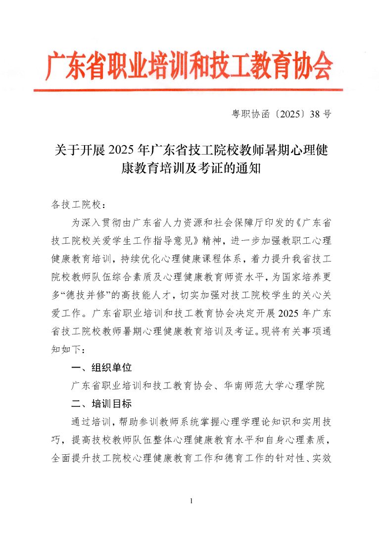 关于开展2025 年广东省技工院校教师暑期心理健康教育培训及考证的通知