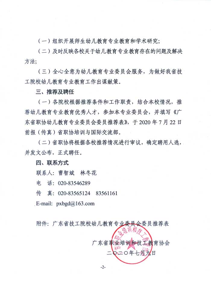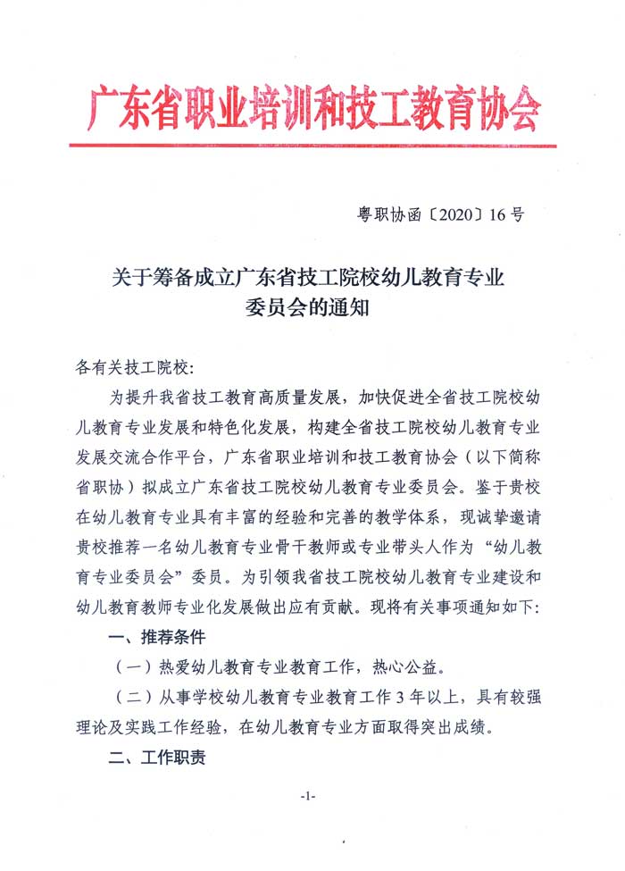 文件下载:关于筹备成立广东省技工院校幼儿教育专业委员会的通知(粤职协函〔2020〕16号)