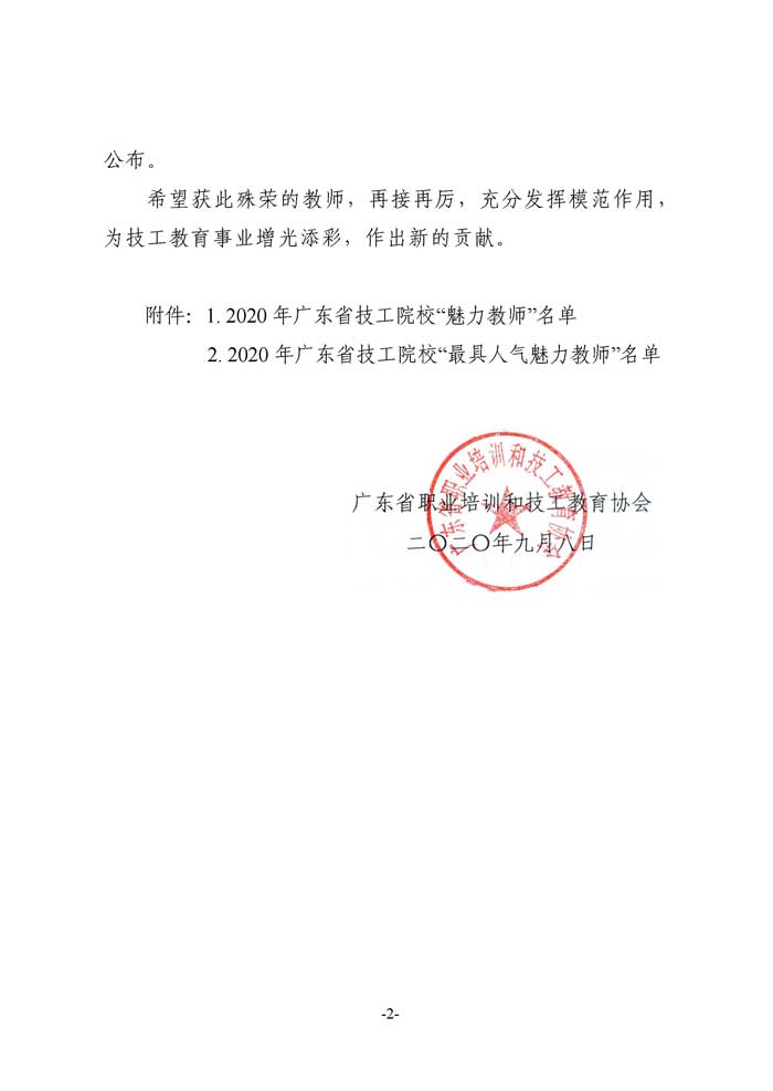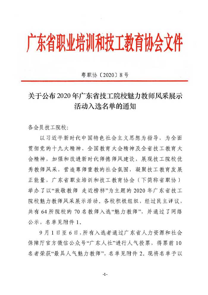 文件下载:关于公布2020年广东省技工院校魅力教师风采展示活动入选名单的通知(粤职协〔2020〕8号) 点击下载