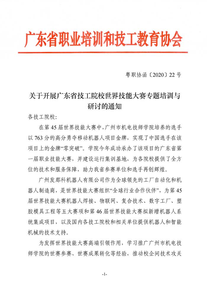 文件下载:关于开展广东省技工院校世界技能大赛专题培训与研讨的通知(粤职协函〔2020〕22号) 点击下载