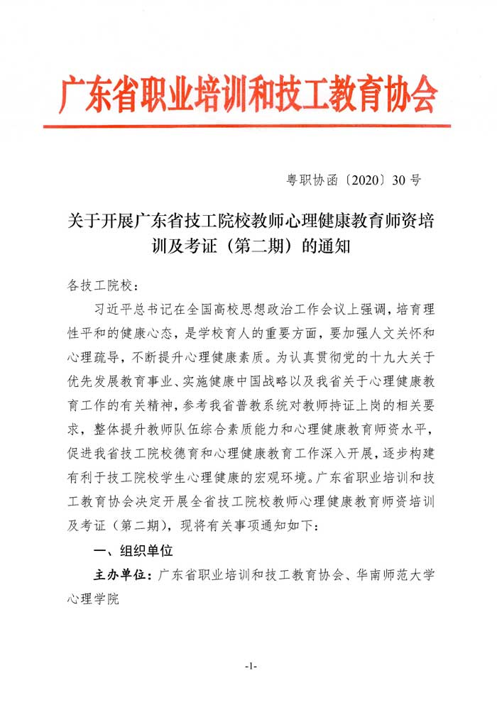 文件下载:关于开展广东省技工院校教师心理健康教育师资培训及考证(第二期)的通知(粤职协函〔2020〕30号) 点击下载