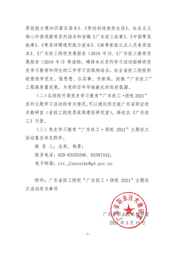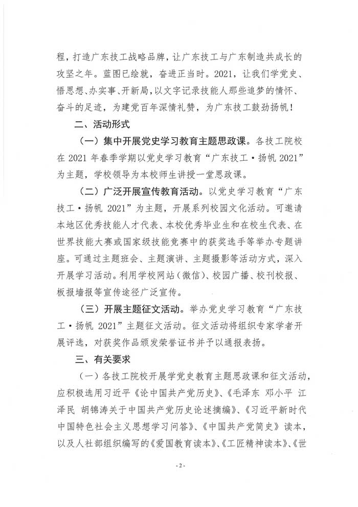 文件下载:关于在全省技工院校开展学党史学习教育“广东技工·扬帆2021”系列主题学习活动的通知(粤职技研〔2021〕37号) 点击下载