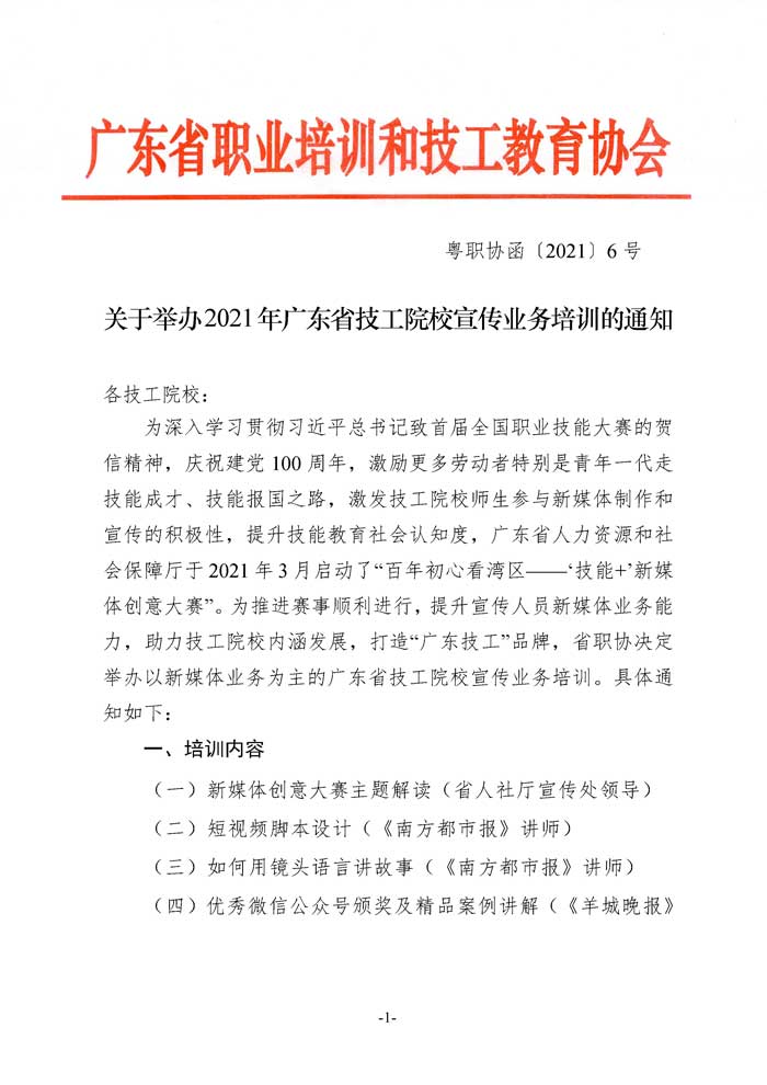文件下载:关于举办2021年广东省技工院校宣传业务培训的通知(粤职协函〔2021〕6号)