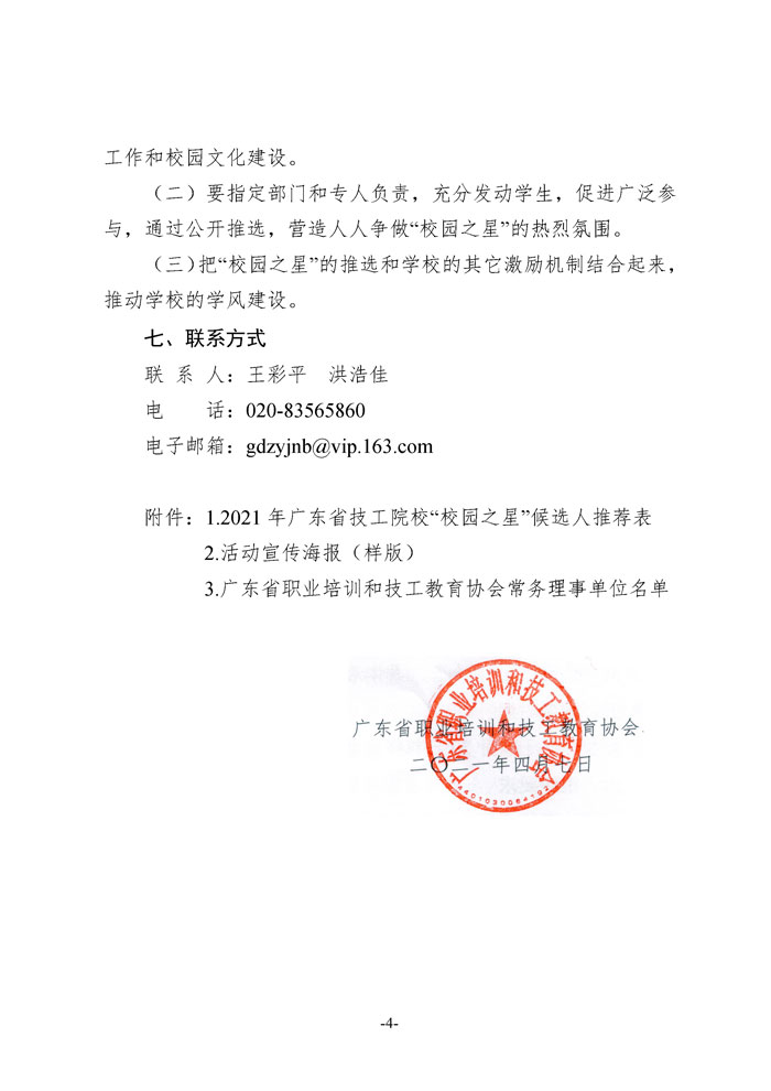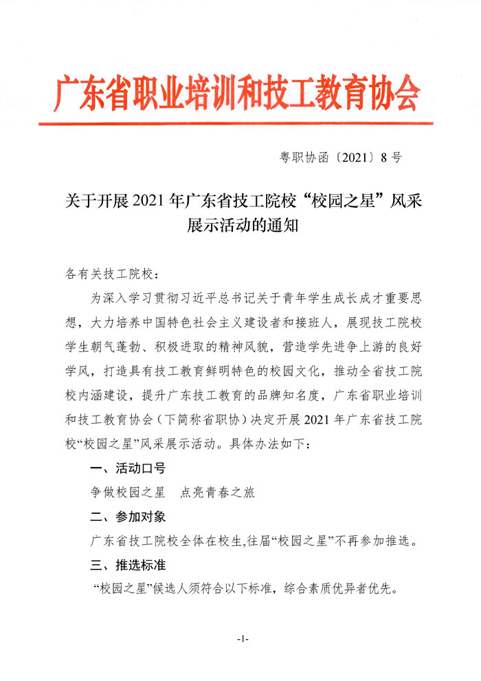 文件下载:关于开展2021年广东省技工院校“校园之星”风采展示活动的通知(粤职协函〔2021〕8号)点击下载
