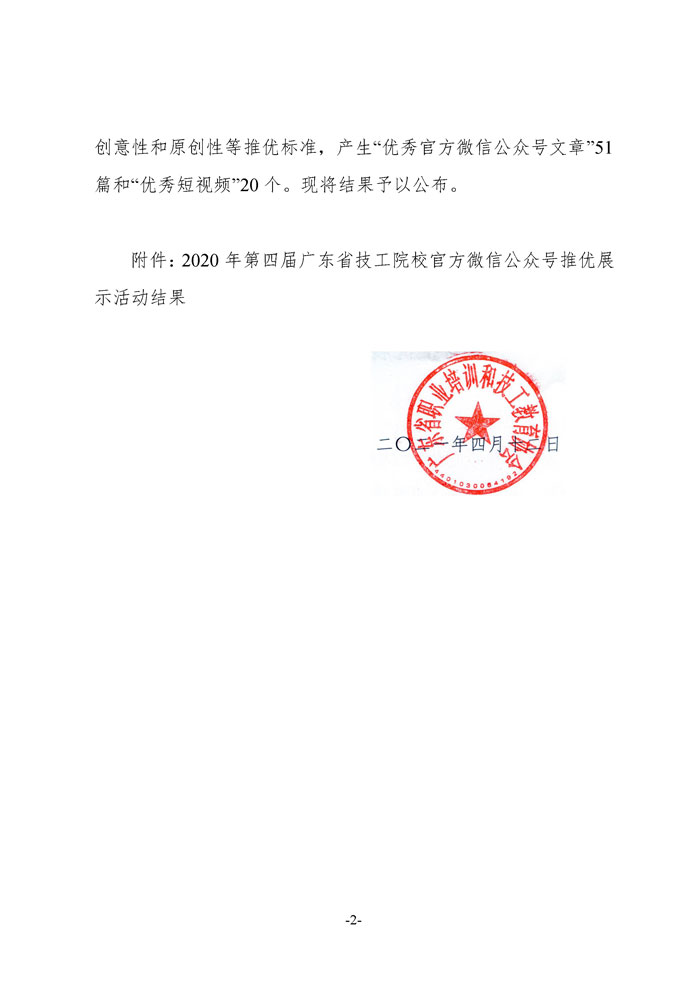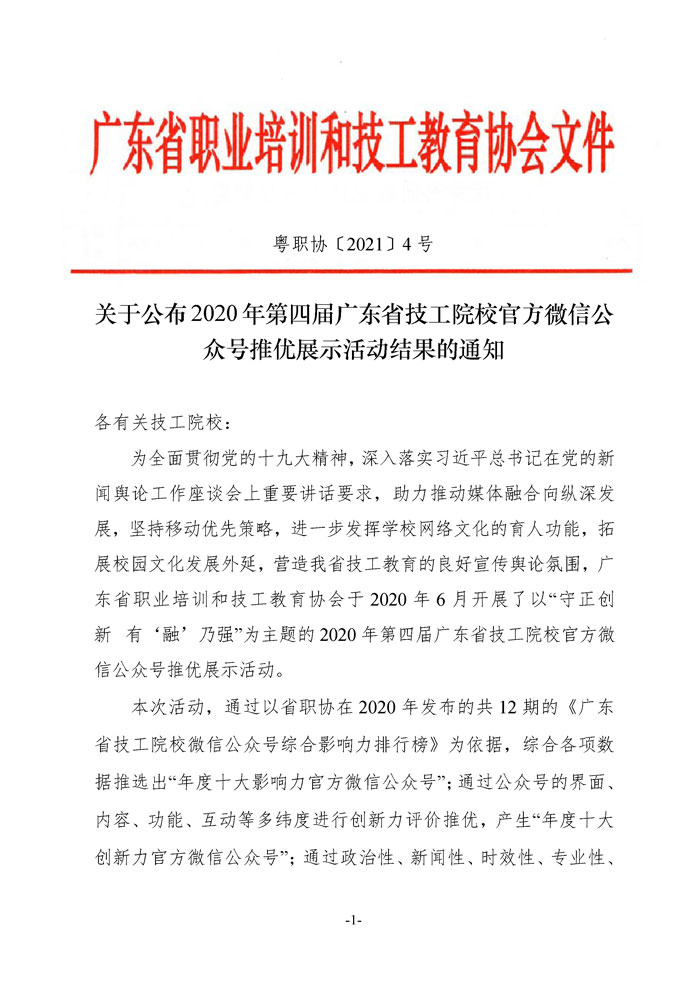 文件下载:关于公布2020年第四届广东省技工院校官方微信公众号推优展示活动结果的通知(粤职协〔2021〕4号) 点击下载