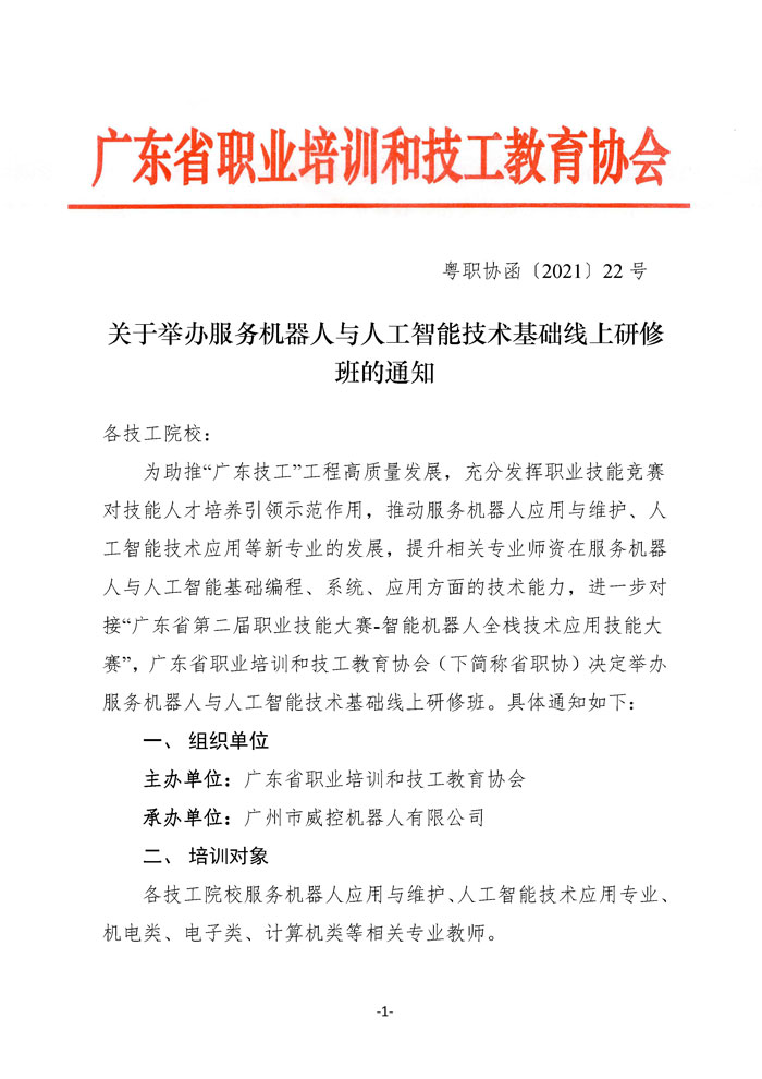 文件下载:关于举办服务机器人与人工智能技术基础线上研修班的通知(粤职协函〔2021〕22号)