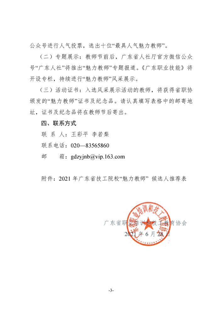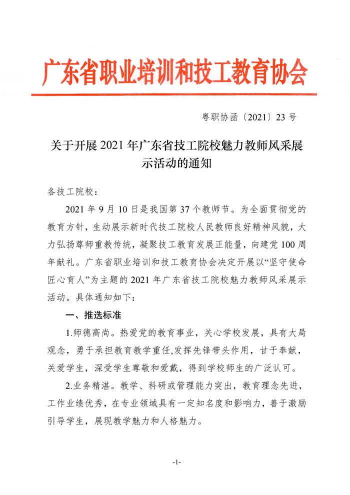 文件下载:关于开展2021年广东省技工院校魅力教师风采展示活动的通知(粤职协函〔2021〕23号)点击下载