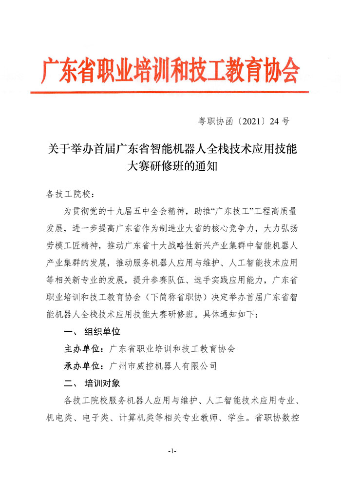文件下载:关于举办首届广东省智能机器人全栈技术应用技能大赛研修班的通知(粤职协函〔2021〕24号)点击下载