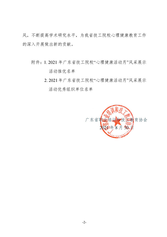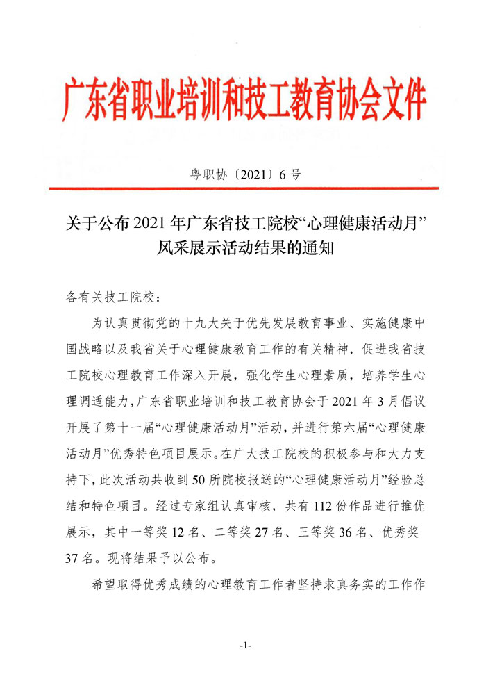 文件下载:关于公布2021年广东省技工院校“心理健康活动月”风采展示活动结果的通知(粤职协〔2021〕6号) 点击下载