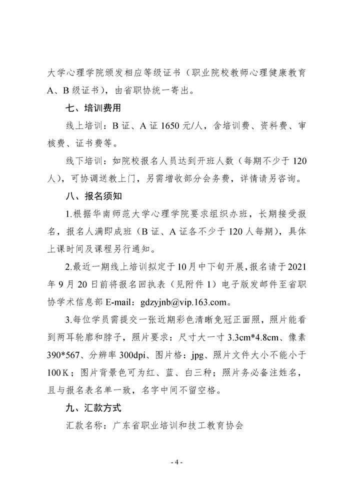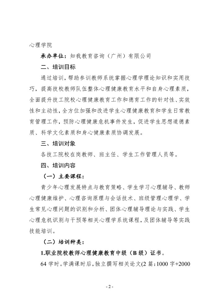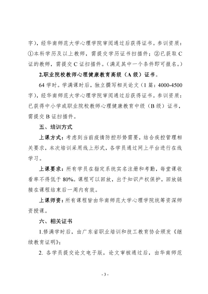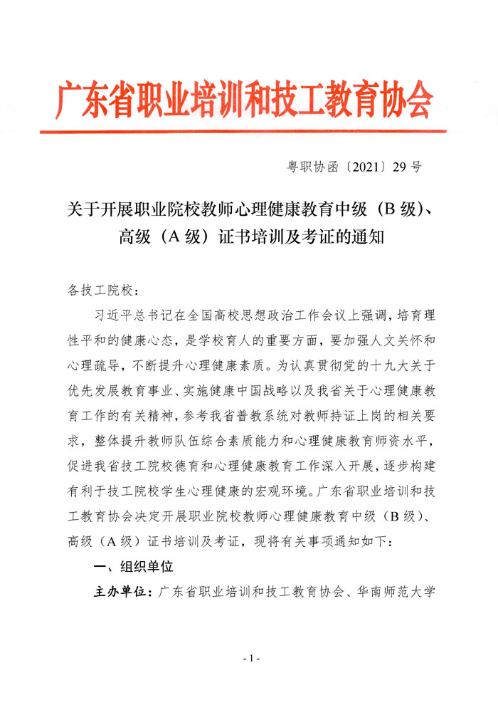 文件下载: 关于开展职业院校教师心理健康教育中级(B级)、高级(A级)证书培训及考证的通知(粤职协函〔2021〕29号)点击下载