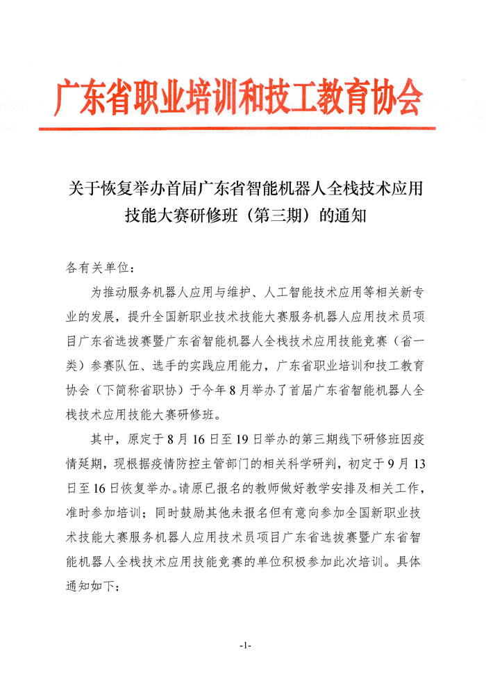 关于恢复举办首届广东省智能机器人全栈技术应用技能大赛研修班(第三期)