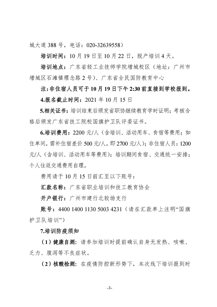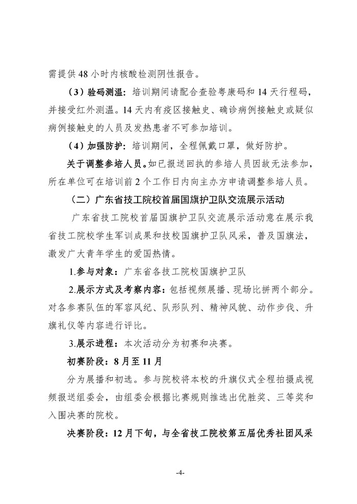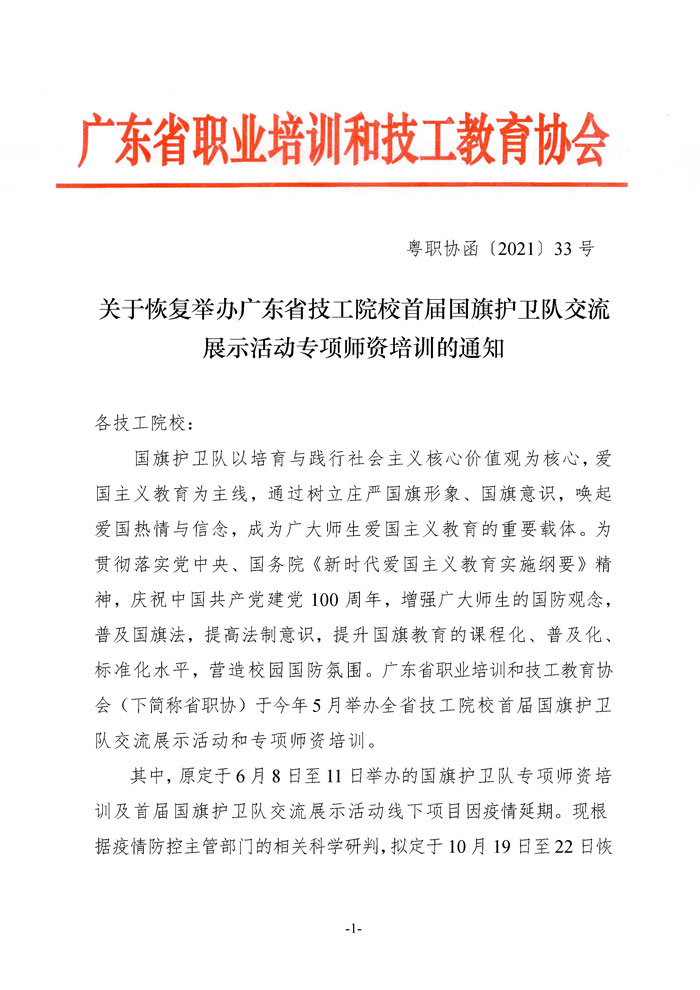 文件下载:关于恢复举办广东省技工院校首届国旗护卫队交流展示活动专项师资培训的通知(粤职协函〔2021〕33号) 点击下载