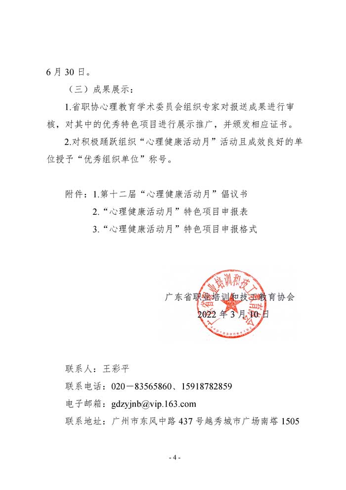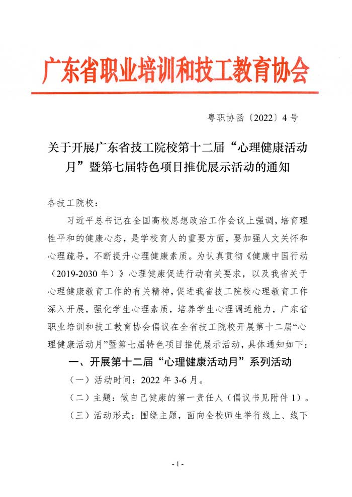 文件下载:关于开展广东省技工院校第十二届“心理健康活动月”暨第七届特色项目推优展示活动的通知(粤职协函〔2022〕4号) 点击下载